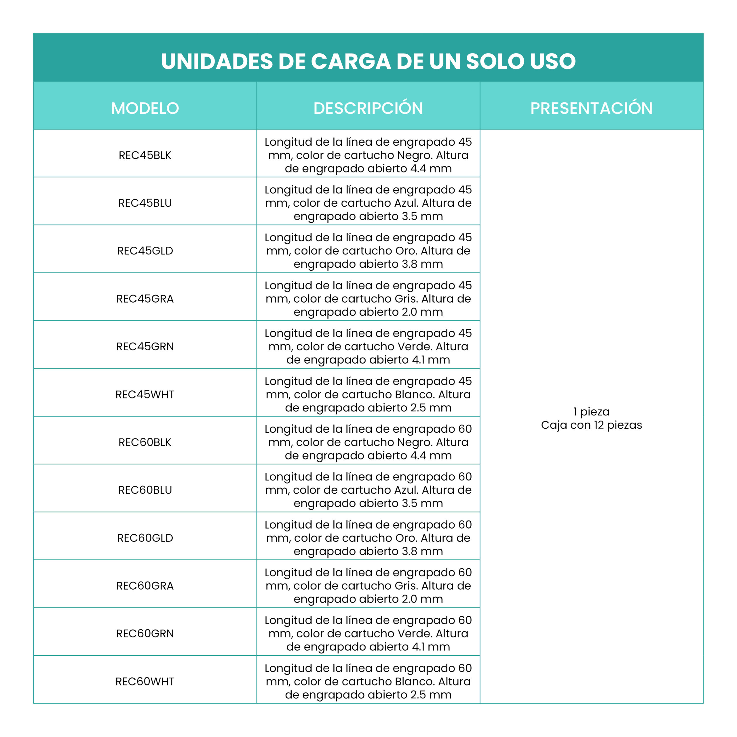 Longitud de la línea de engrapado de 45 mm y 60 mm, según las unidades de recarga.